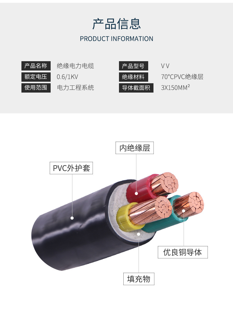Vv Three-Core Insulated Cable Manufacturer Directly Supplies Power Engineering Cable With Rated Voltage Of 0.6/1Kv And Pvc Sheath